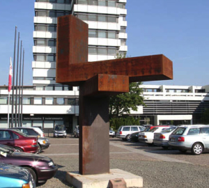 Die stahlplastik „aufragende", 2012, des jockgrimer bildhauers franz bernhard soll noch in diesem jahr vor dem mpk platziert werden. Fackelstraße 30/fußgängerzone, 67655 kaiserslautern, germany